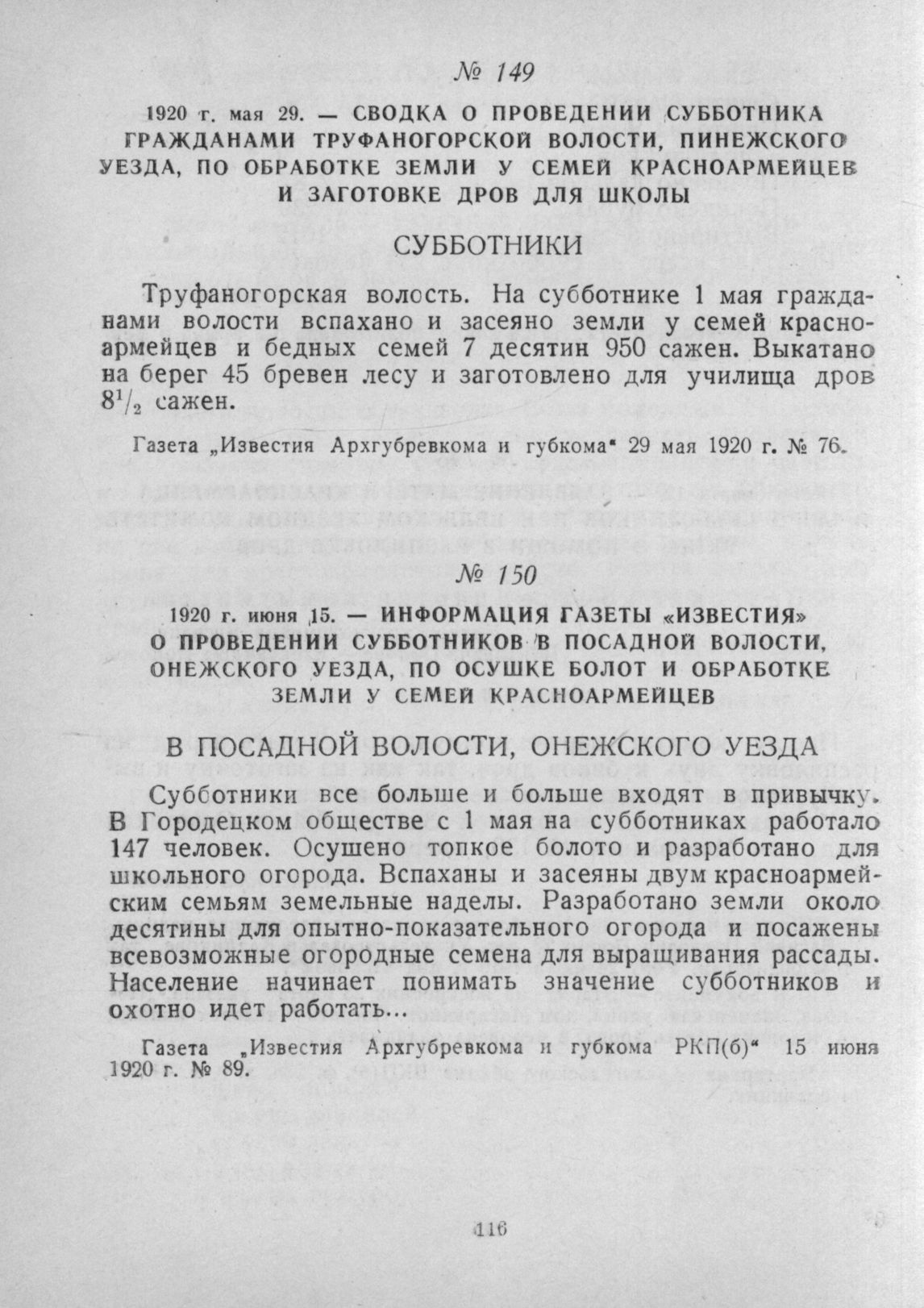 Информация газеты «Известия» о проведении субботников в Посадной волости, Онежского уезда, по осушке болот и обработке земли у семей красноармейцев. 15 июня 1920 г. // Газета «Известия Архгубревкома и губкома РКП(б)», 15 июня 1920 г. № 89.