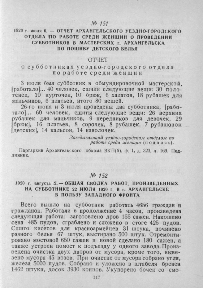 Общая сводка работ, произведенных на субботнике 22 июля 1920 г. в г. Архангельске в пользу западного фронта. 2 августа 1920 г. // Партархив Архангельского обкома ВКП(б), Ф. 1, Д. 319, Л. 284. Подлинник.