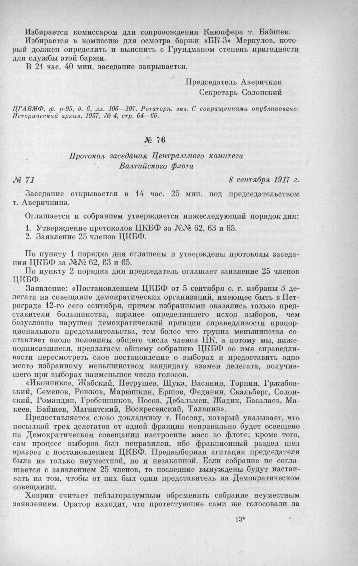 Протокол заседания Центрального комитета Балтийского флота № 71. 8 сентября 1917 г. // ЦГАВМФ, ф. р.-95, д. 6, лл. 108—109. Ротаторн. экз. Опубликовано: Исторический архив, 1957, № 4, стр. 66—69.