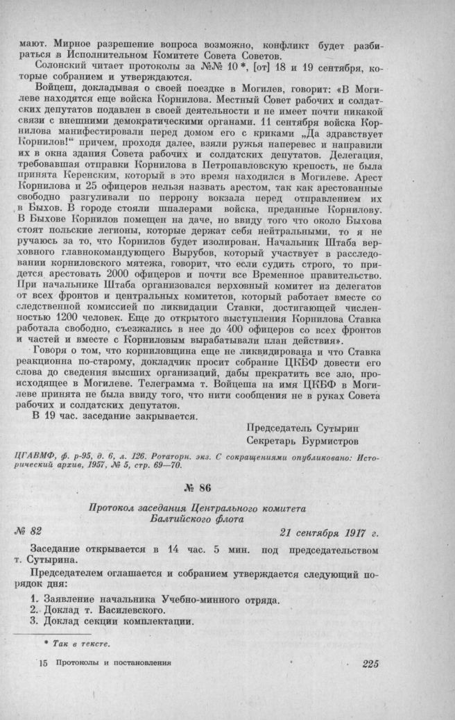 Протокол заседания Центрального комитета Балтийского флота № 82. 21 сентября 1917 г. // ЦГАВМФ, ф. р.-95, д. 6, лл. 127—128. Ротаторн. экз.