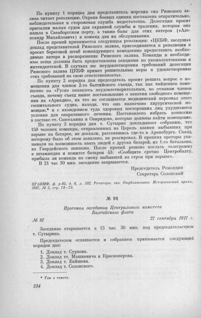 Протокол заседания Центрального комитета Балтийского флота № 87. 27 сентября 1917 г. // ЦГАВМФ, ф. р.-95, д. 6, л. 137. Ротаторн. экз. Опубликовано: Исторический архив, 1957, № 5, стр. 75—76.