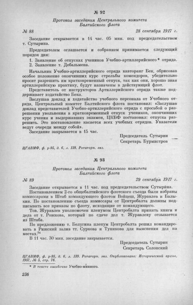 Протокол заседания Центрального комитета Балтийского флота № 89. 29 сентября 1917 г. // ЦГАВМФ, ф. р.-95, д. 6, л. 139. Ротаторн. экз. Опубликовано: Исторический архив, 1957, № 5, стр. 76.