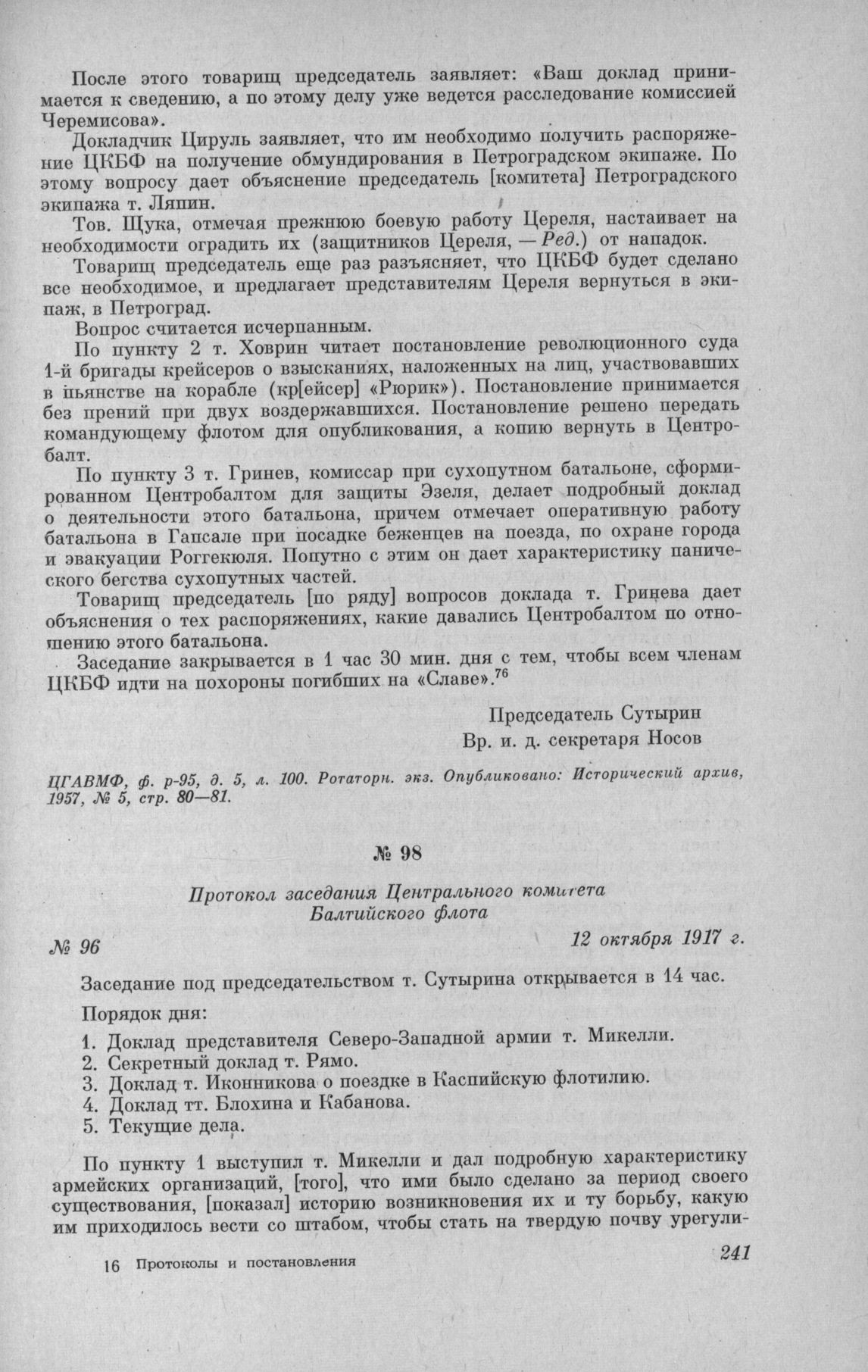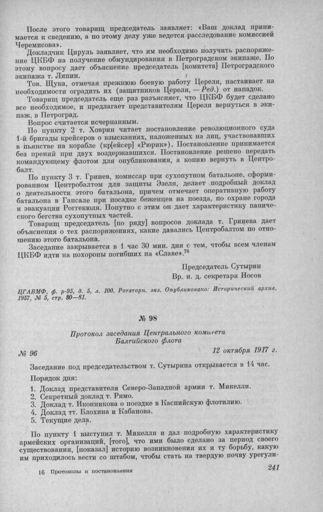 Протокол заседания Центрального комитета Балтийского флота № 96. 12 октября 1917 г. // ЦГАВМФ, ф. р.-95, д. 5, л. 101. Ротаторн. экз. Опубликовано: Исторический архив, 1957, № 5, стр. 81—82.