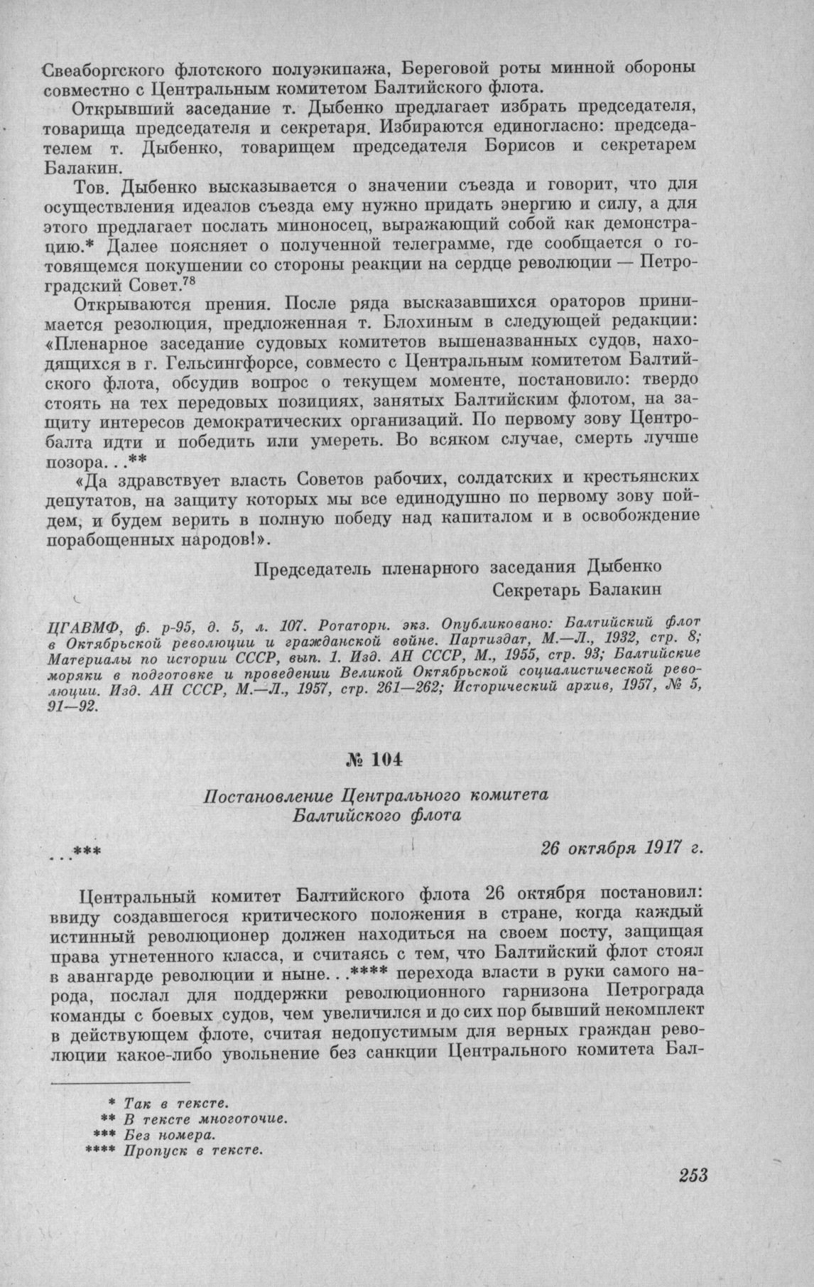 Постановление Центрального комитета Балтийского флота. 26 октября 1917 г. // ЦГАВМФ, ф. р.-95, д. 72, л. 77. Ротаторн. экз. Опубликовано: Балтийский флот в Октябрьской революции и гражданской войне. Партиздат, М.—Л., 1932, стр. 15; Балтийские моряки в подготовке и проведении Великой Октябрьской социалистической революции. Изд. АН СССР, М.— Л., 1957, стр. 290—291.