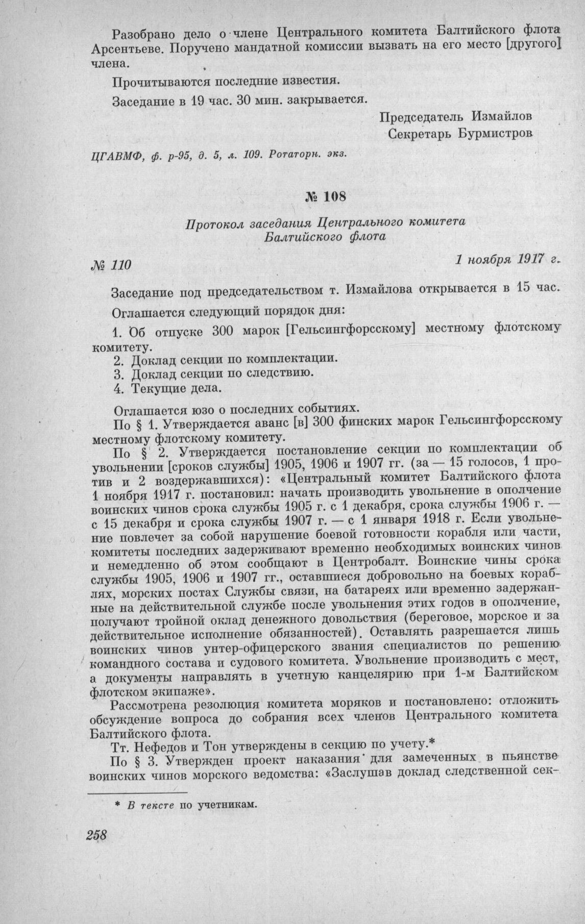Протокол заседания Центрального комитета Балтийского флота № 110. 1 ноября 1917 г.