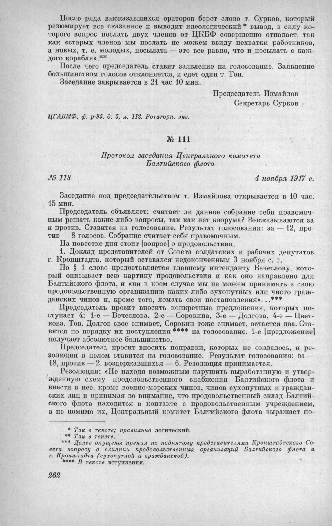 Протокол заседания Центрального комитета Балтийского флота № 113. 4 ноября 1917 г. // ЦГАВМФ, ф. р.-95, д. 5, л. 113. Ротаторн. экз.
