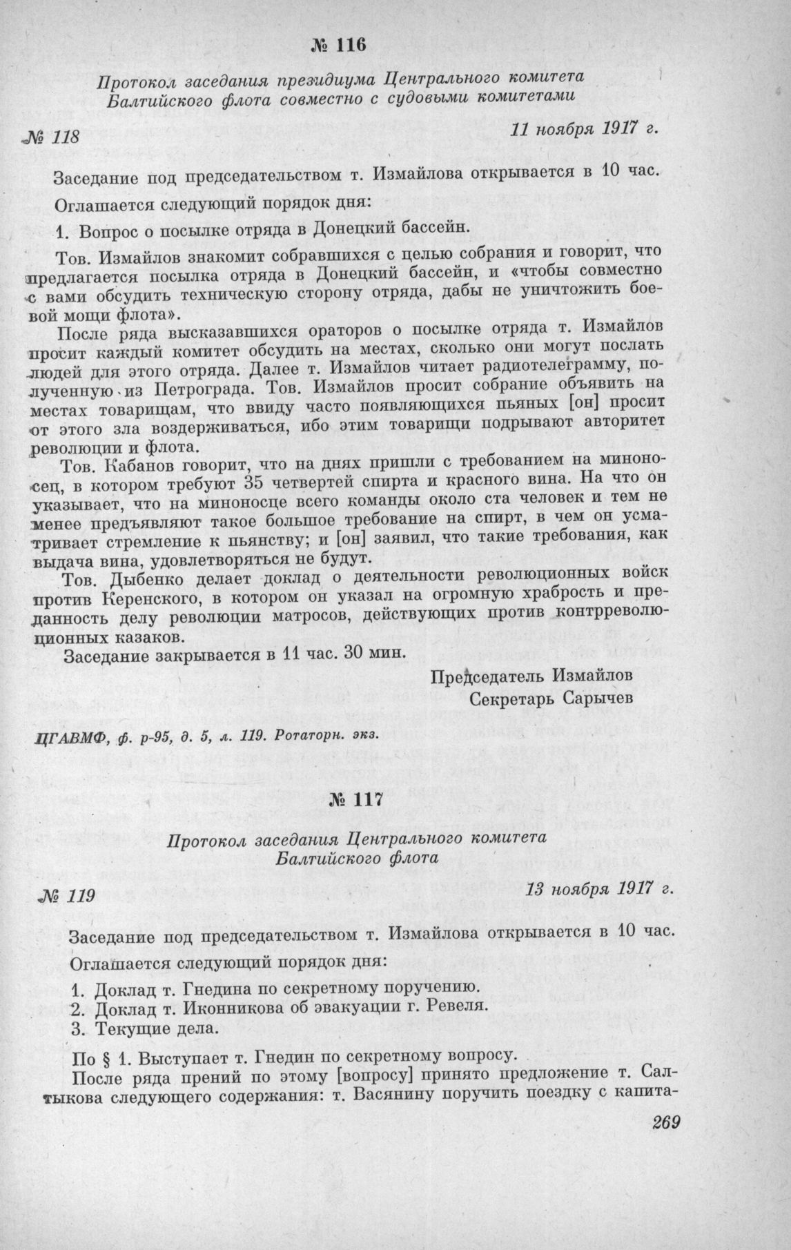 Протокол заседания Центрального комитета Балтийского флота № 119. 13 ноября 1917 г. // ЦГАВМФ, ф. р.-95, д. 5, лл. 120—121. Ротаторн. экз.