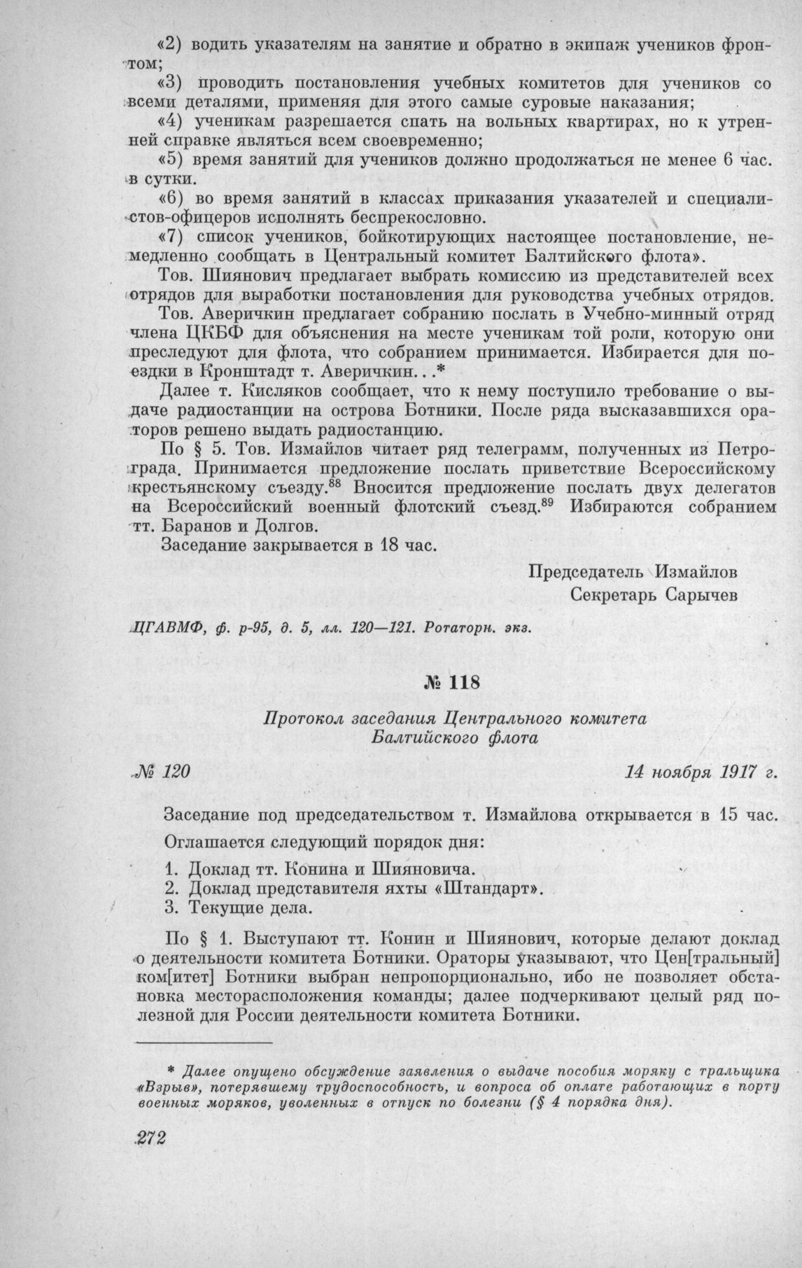Протокол заседания Центрального комитета Балтийского флота № 120. 14 ноября 1917 г. // ЦГАВМФ, ф. р.-95, д. 5, л. 122. Ротаторн. экз.