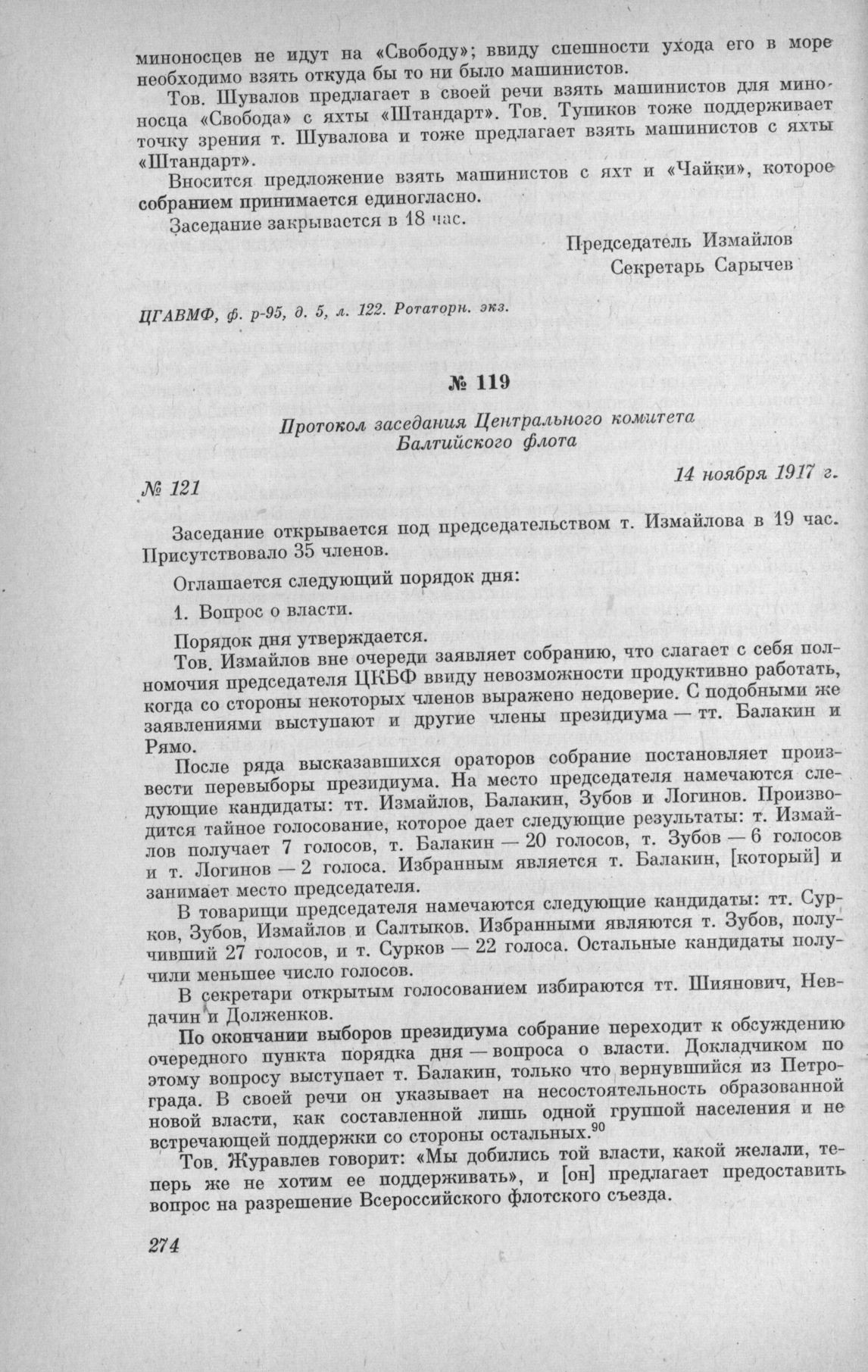 Протокол заседания Центрального комитета Балтийского флота № 121. 14 ноября 1917 г. // ЦГАВМФ, ф. р.-95, д. 5, л. 123. Ротаторн. экз.