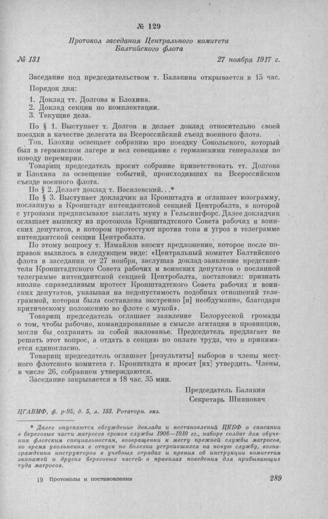 Протокол заседания Центрального комитета Балтийского флота № 131. 27 ноября 1917 г. // ЦГАВМФ, ф. р.-95, д. 5, л. 133. Ротаторн. экз.