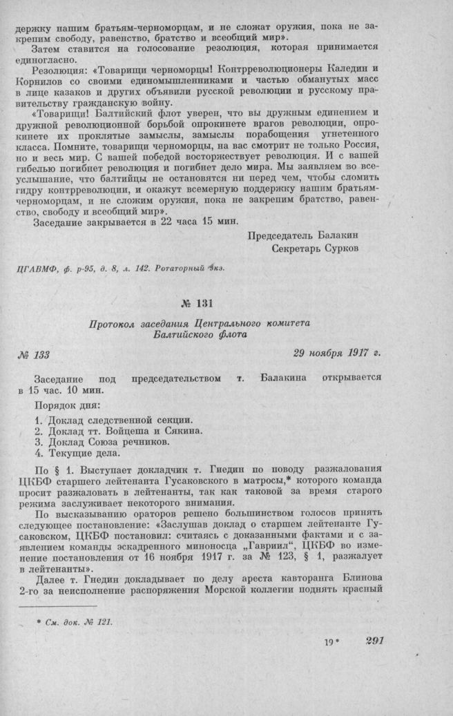 Протокол заседания Центрального комитета Балтийского флота № 133. 29 ноября 1917 г. // ЦГАВМФ, ф. р.-95, д. 5, л. 134. Ротаторн. экз.
