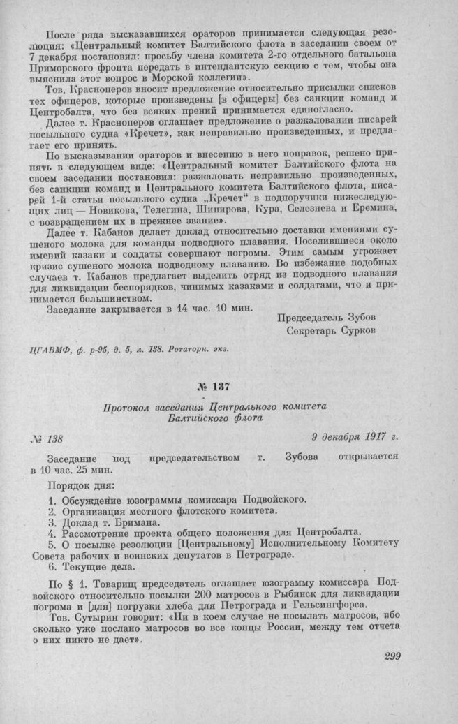Протокол заседания Центрального комитета Балтийского флота № 138. 9 декабря 1917 г. // ЦГАВМФ, ф. р.-95, д. 5, л. 139. Ротаторн. экз.