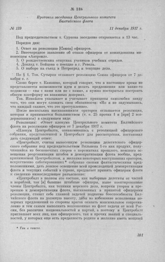 Протокол заседания Центрального комитета Балтийского флота № 139. 11 декабря 1917 г.