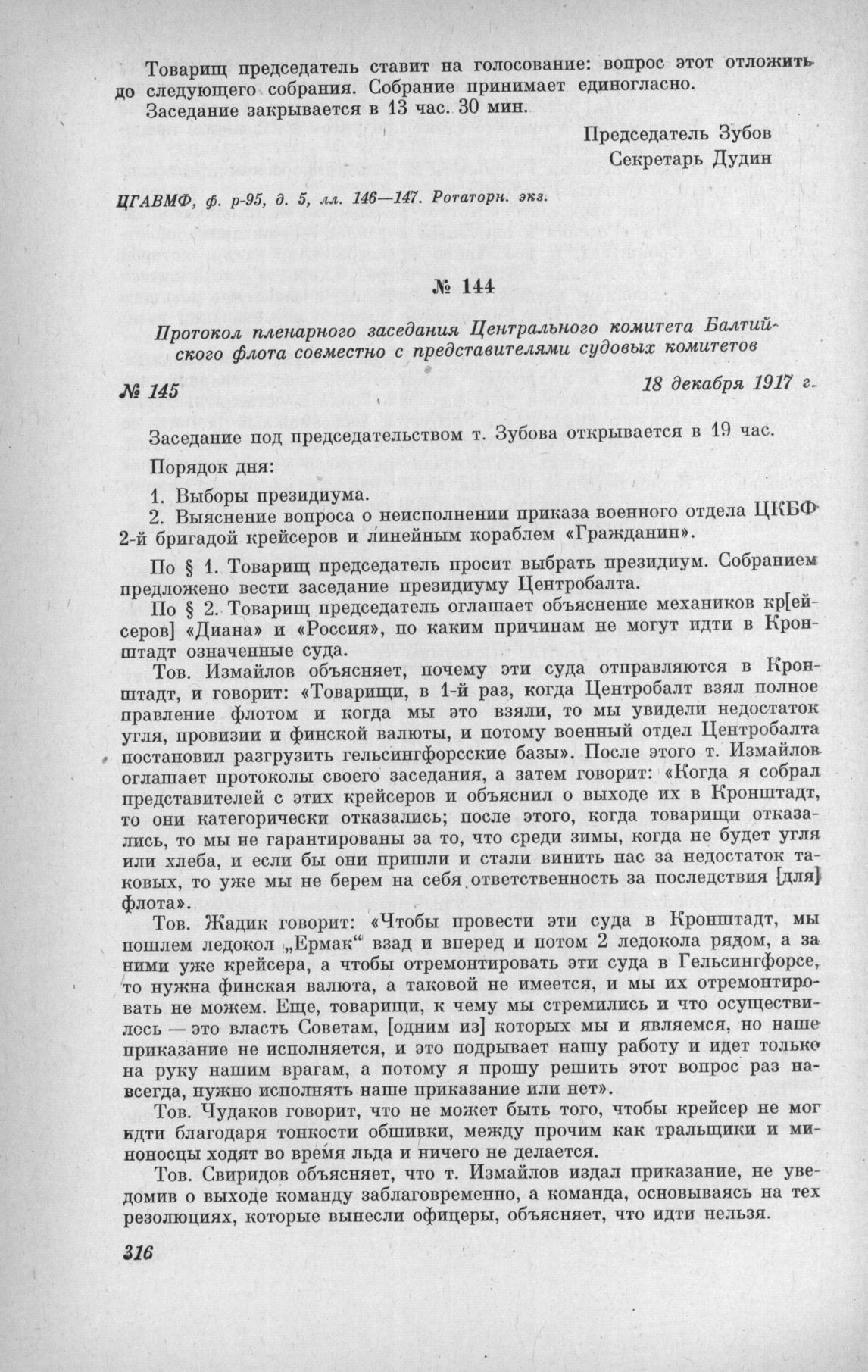 Протокол пленарного заседания Центрального комитета Балтийского флота совместно с представителями судовых комитетов № 145. 18 декабря 1917 г. // ЦГАВМФ, ф. р.-95, д. 7, л. 252. Ротаторн. экз.
