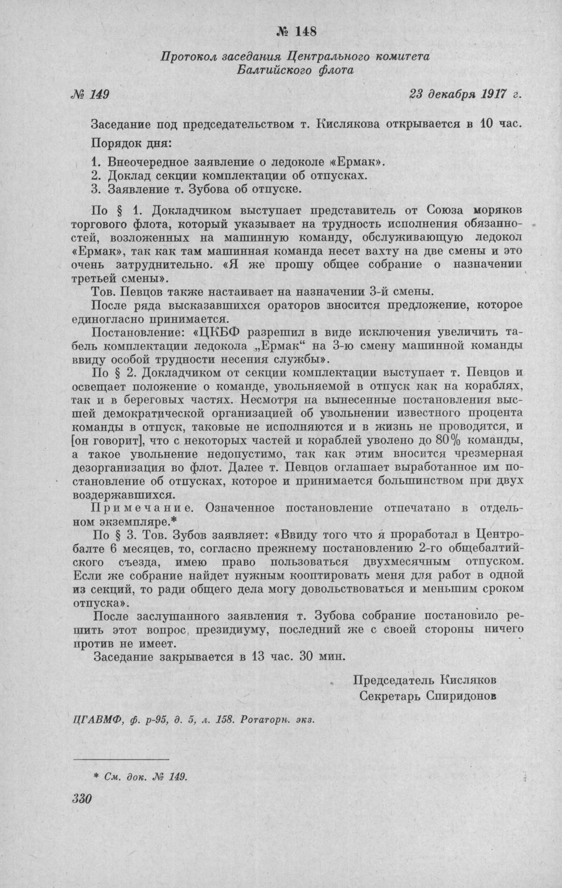 Протокол заседания Центрального комитета Балтийского флота № 149. 23 декабря 1917 г. // ЦГАВМФ, ф. р.-95, д. 5, л. 158. Ротаторн. экз.