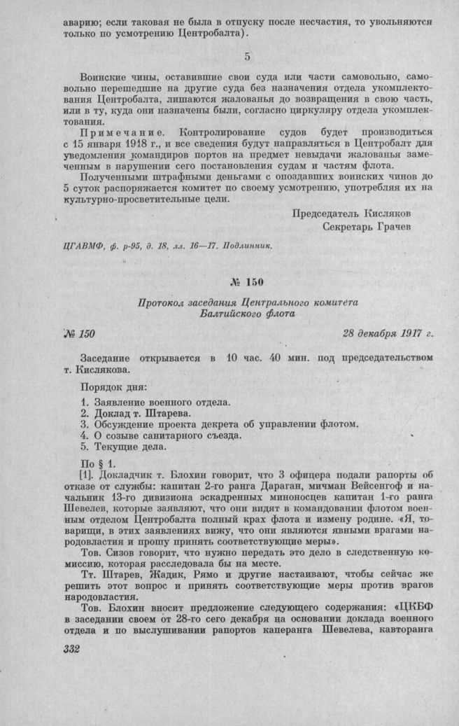 Протокол заседания Центрального комитета Балтийского флота № 150. 28 декабря 1917 г. // ЦГАВМФ, ф. р.-95, д. 7, лл. 269—272. Ротаторн. экз.