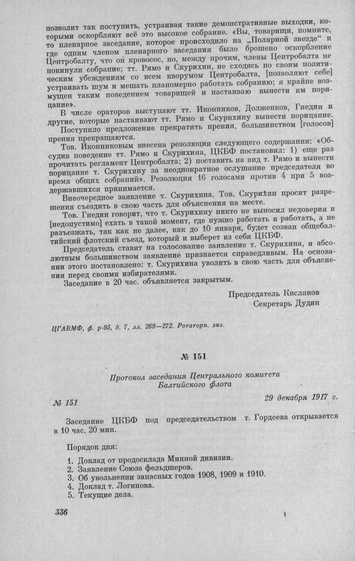 Протокол заседания Центрального комитета Балтийского флота № 151. 29 декабря 1917 г. // ЦГАВМФ, ф. р.-95, д. 11, лл. 131, 132, 134. Черновик.