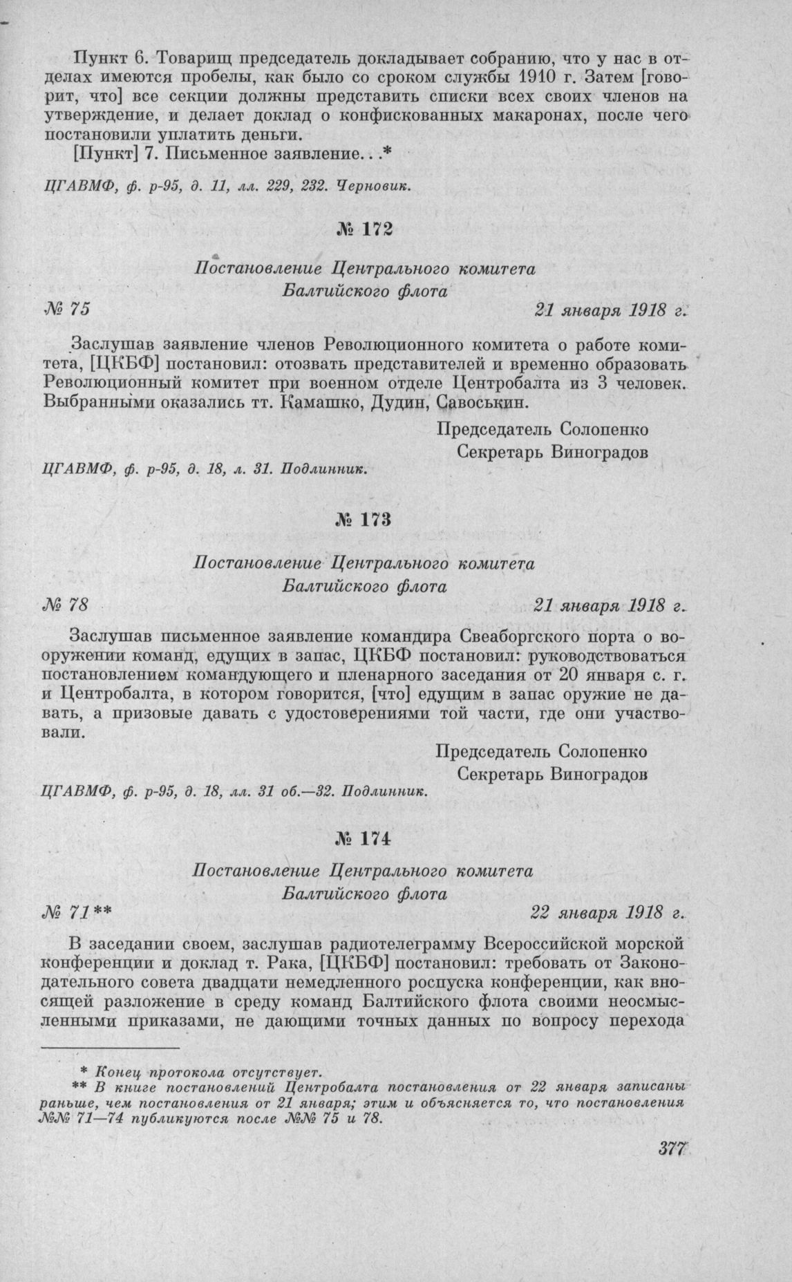 Постановление Центрального комитета Балтийского флота № 71. 22 января 1918 г. // ЦГАВМФ, ф. р.-95, д. 18, лл. 29— 30. Подлинник.
