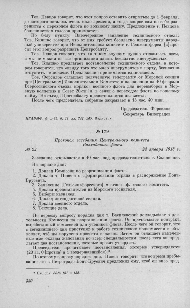Протокол заседания Центрального комитета Балтийского флота № 23. 24 января 1918 г. // ЦГАВМФ, ф. р.-95, д. 11, лл. 245, 249, 252. Черновик.
