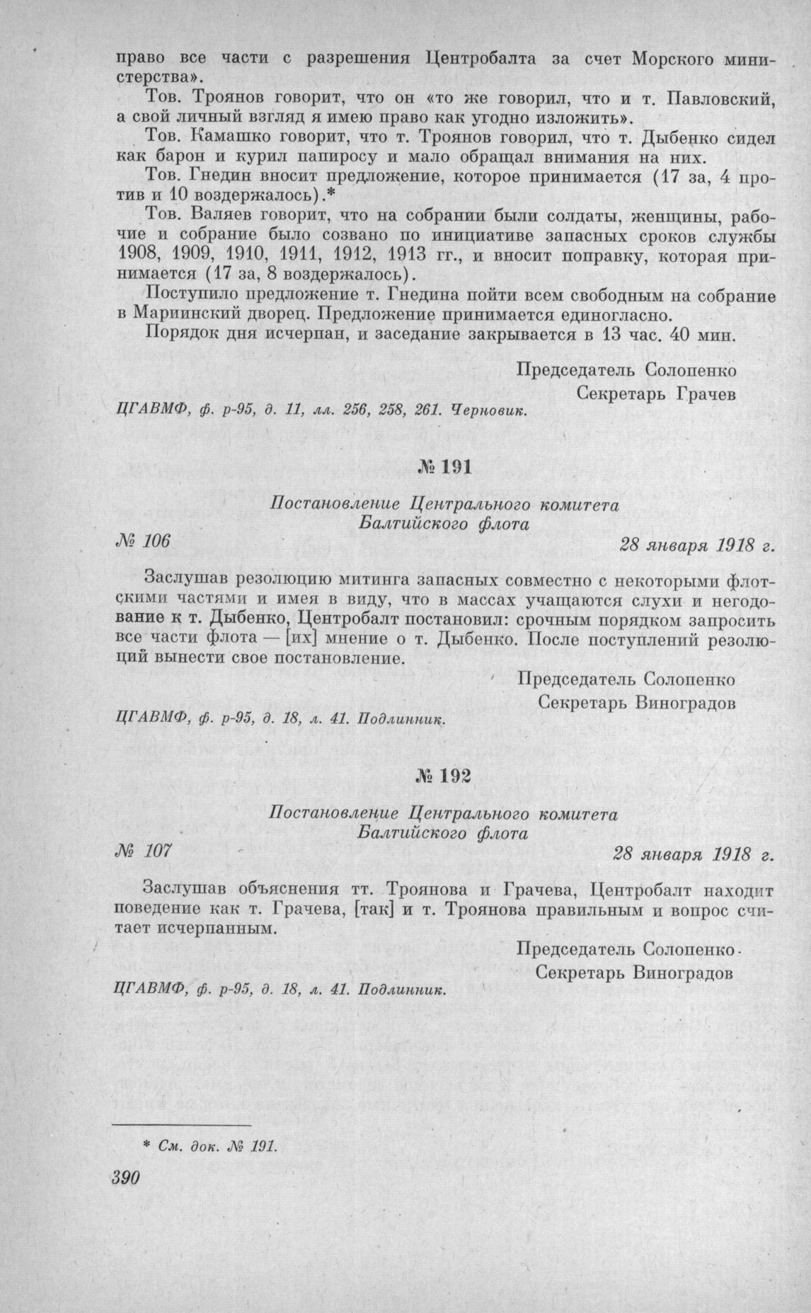 Постановление Центрального комитета Балтийского флота № 106. 28 января 1918 г. // ЦГАВМФ, ф. р.-95, д. 18, л. 41. Подлинник.