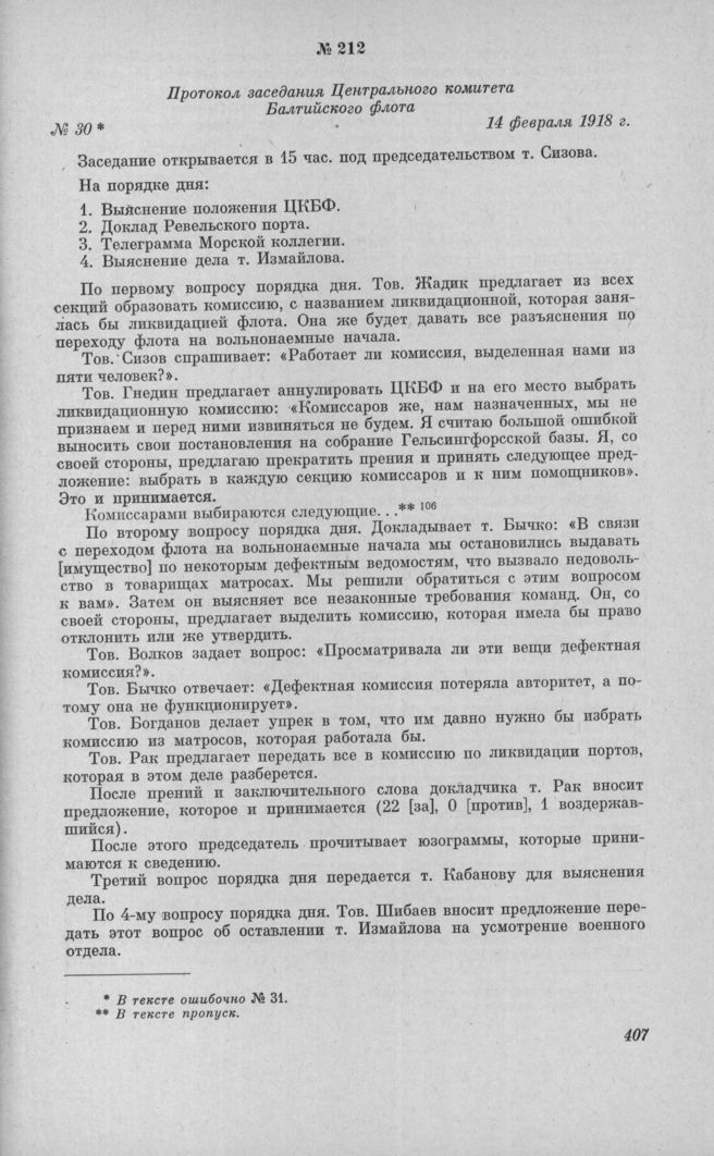 Протокол заседания Центрального комитета Балтийского флота № 30. 14 февраля 1918 г. // ЦГАВМФ, ф. р.-95, д. 11, лл. 297, 299. Черновик.