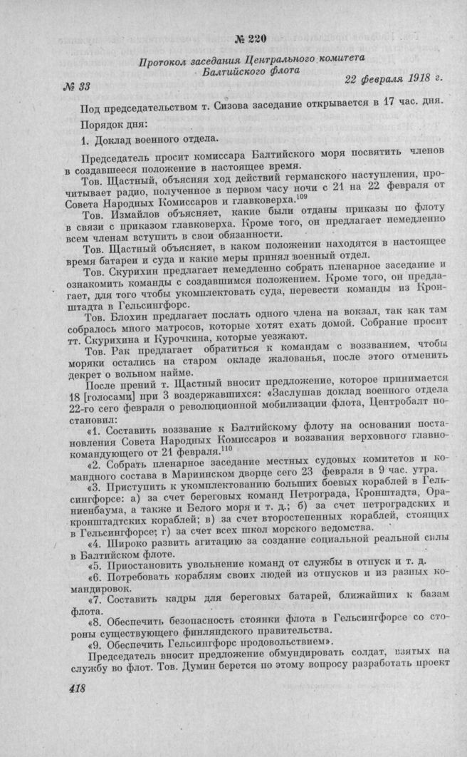 Протокол заседания Центрального комитета Балтийского флота № 33. 22 февраля 1918 г. // ЦГАВМФ, ф. р.-95, д. 160, л. 53. Ротаторн. экз.