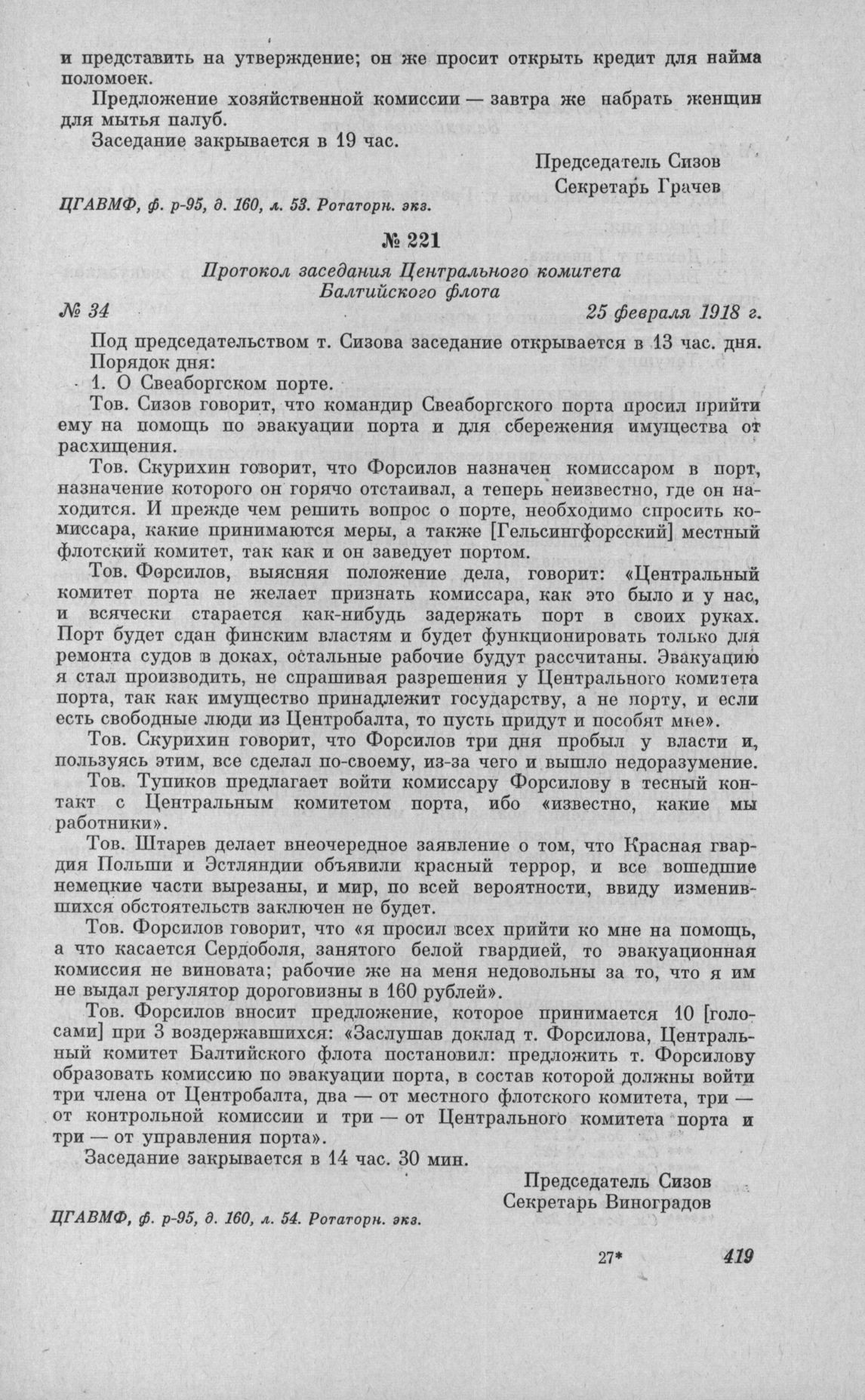 Протокол заседания Центрального комитета Балтийского флота № 34. 25 февраля 1918 г. // ЦГАВМФ, ф. р.-95, д. 160, л. 54. Ротаторн. экз.