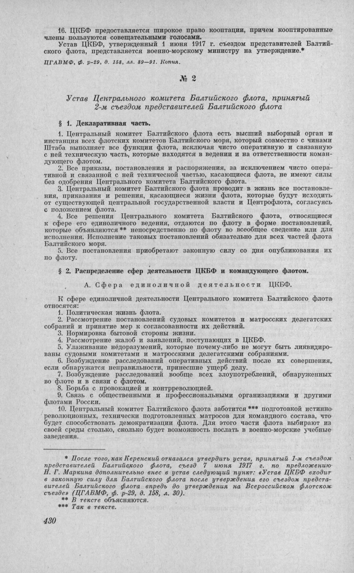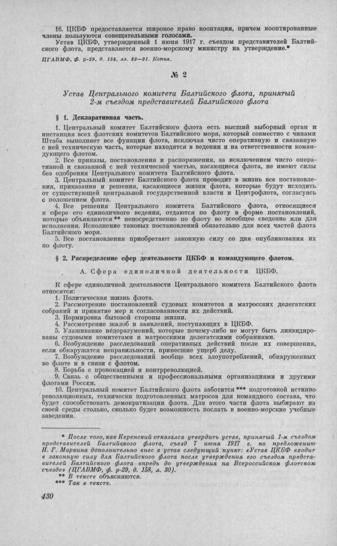 Устав Центрального комитета Балтийского флота, принятый 2-м съездом представителей Балтийского флота // ЦГАВМФ, ф. р-95, д. 64, лл. 142— 144. Типогр. экз.