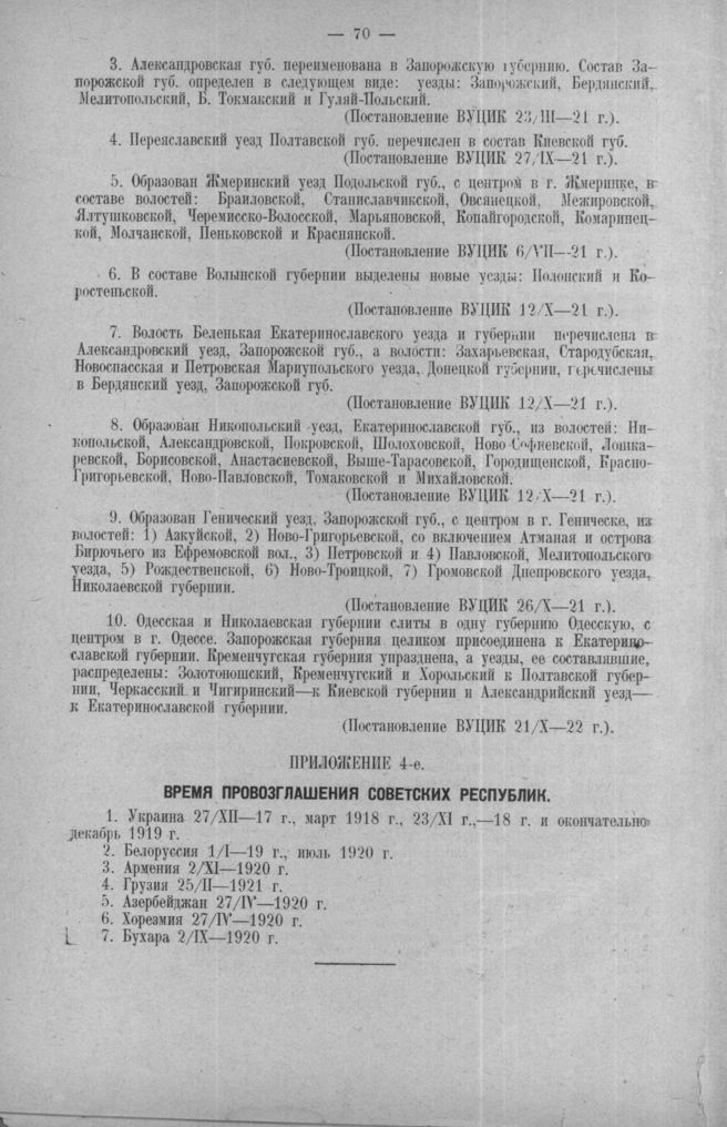 Постановления рабоче-крестьянского правительства. Приложение 4-е. Время провозглашения советских республик