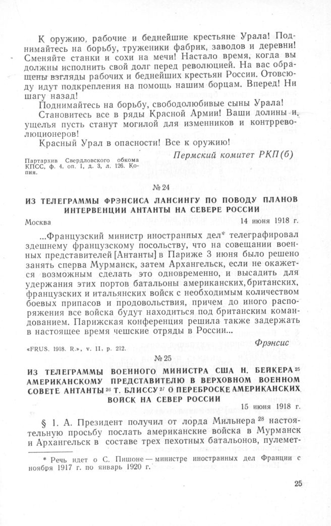 Из телеграммы военного министра США Н. Бейкера американскому представителю в Верховном Военном Совете Антанты Т. Блиссу о переброске американских войск на север России. 15 июня 1918 г. // Р. С. March. «The Nation at War». New York. 1932, pp. 135-136.