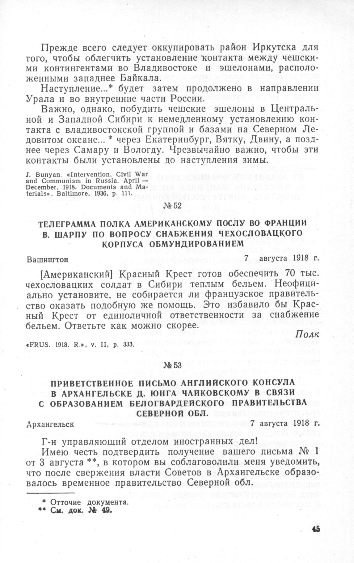 Приветственное письмо английского консула в Архангельске Д. Юнга Чайковскому в связи с образованием белогвардейского правительства Северной обл. Архангельск, 7 августа 1918 г. // «Интервенция на Севере в документах». Сб. док., М., 1933, стр. 15