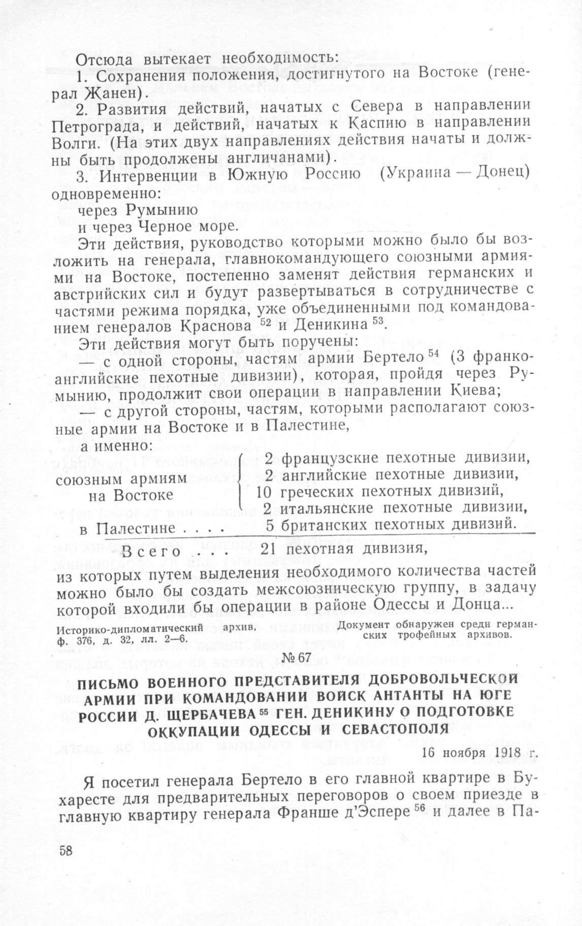 Письмо военного представителя Добровольческой Армии при командовании войск Антанты на юге России Д. Щербачева ген. Деникину о подготовке оккупации Одессы и Севастополя. 16 ноября 1918 г.