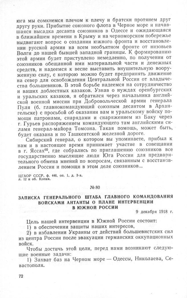 Записка Генерального штаба Главного командования войсками Антанты о плане интервенции в Южной России. 9 декабря 1918 г. // Историко-дипломатический архив, Ф. 376, д. 32, лл. 95-96.