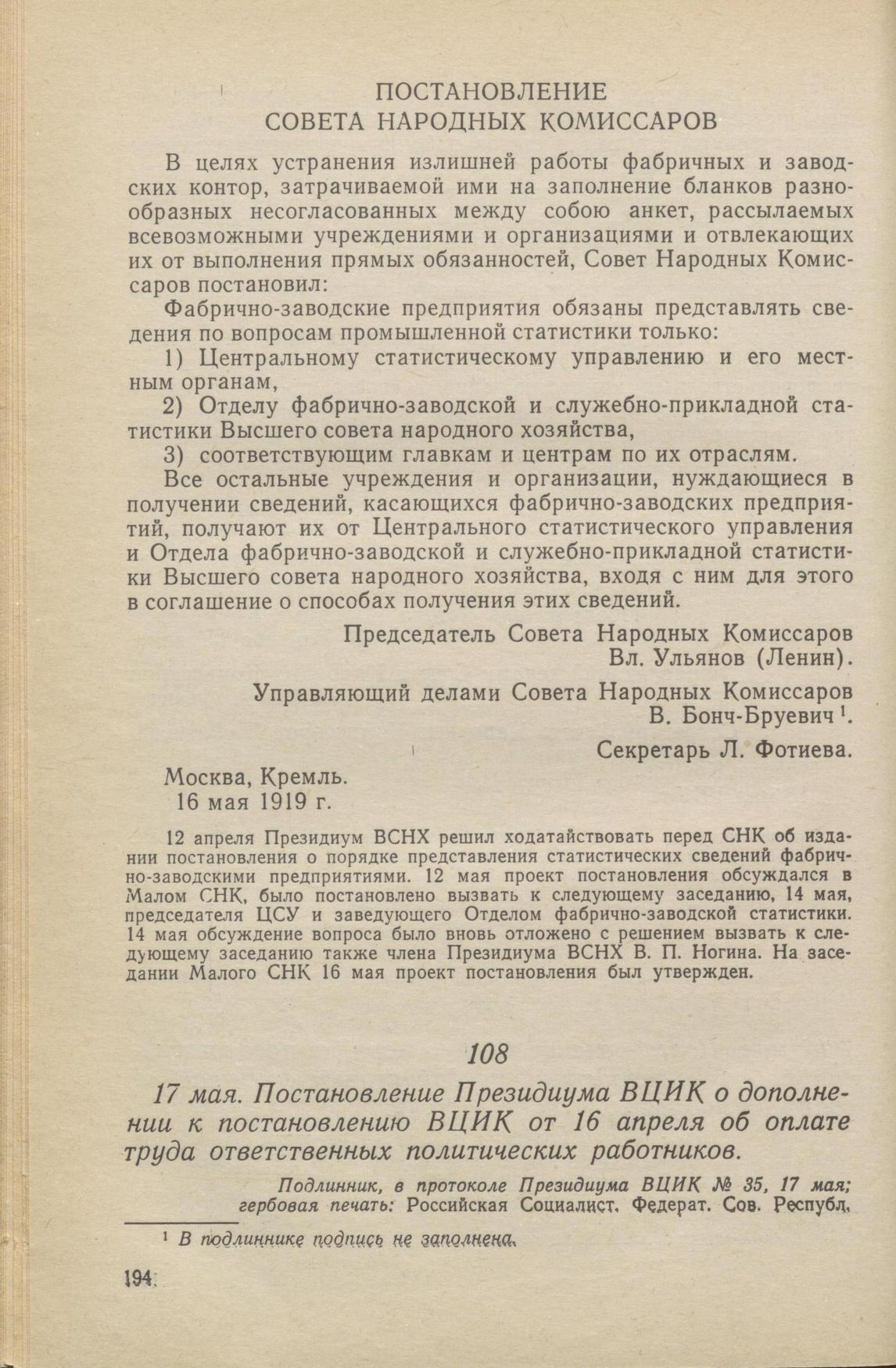 17 мая. Постановление Президиума ВЦИК о дополнении к постановлению ВЦИК от 16 апреля об оплате труда ответственных политических работников // Подлинник, в протоколе Президиума ВЦИК № 35, 17 мая; гербовая печать: Российская Социалист. Федерат. Сов. Респубд. Всероссийск . Центр. Исполн. Комитет Советов раб., Крест., казач. и красноарм. деп. ЦГАОР, ф. 1235, оп. 36, ед. хр. 65, л. 160.—Копия; пометки: 20/V -19 || 97982 в Отд. опубл. законов при Нарком юст. 97983 «РОСТА». 97984 «Известия ВЦИК». 97985 «Правда» || На обороте сего препровождается постановление Президиума ВЦИК от 17 мая 1919 г. для срочного опубликования. Вр. исп. об. зав. Общ. канц. ВЦИК. Там же, л. 189. «Известия» № 108, 21 мая; «Правда» № 108, 21 мая; «Собрание Узаконений» № 20, ст. 243.