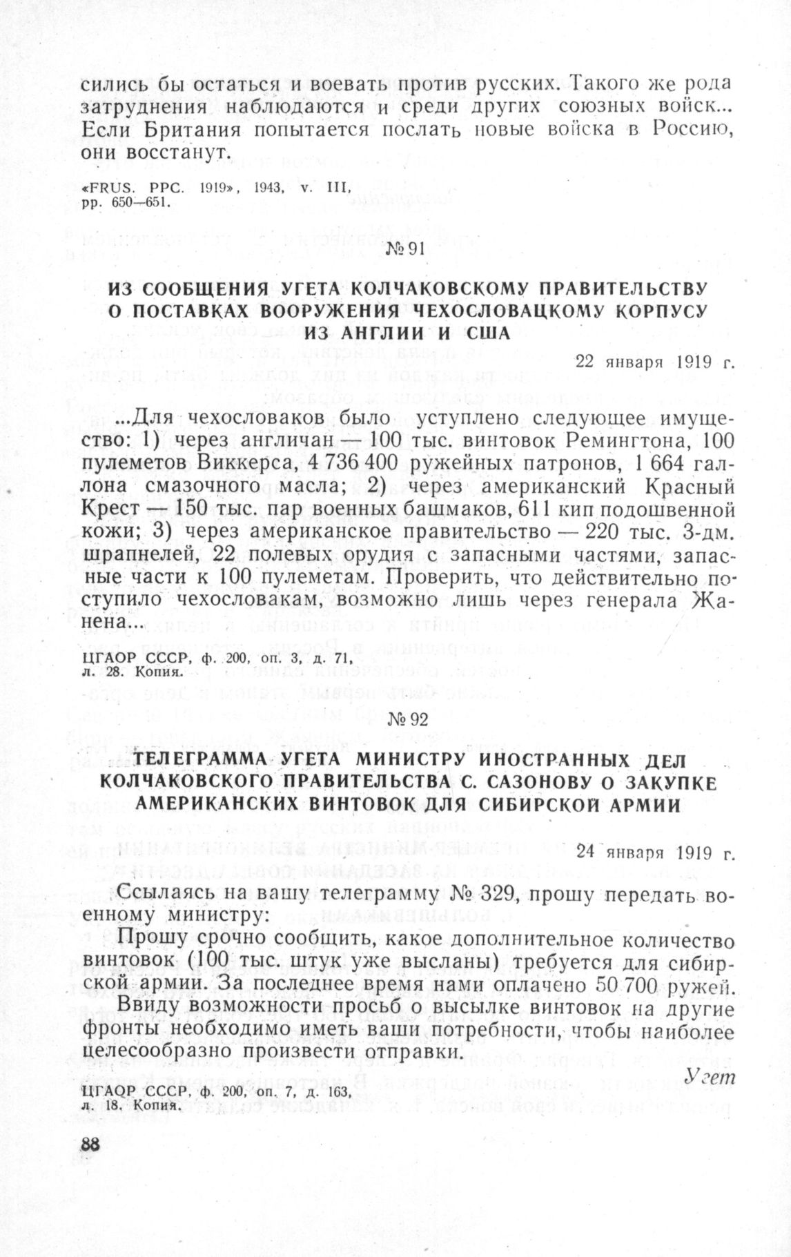 Из сообщения Угета колчаковскому правительству о поставках вооружения Чехословацкому корпусу из Англии и США. 22 января 1919 г. // ЦГАОР СССР, ф. 200, оп. 3, д. 71, л. 28. Копия.