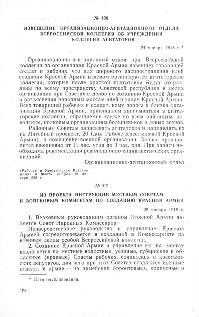 Извещение Организационно-агитационного отдела Всероссийской Коллегии об учреждении Коллегии агитаторов. 24 января 1918 г. // «Рабочая и Крестьянская Красная Армия и Флот» № 6(51), 24 января 1918 г.