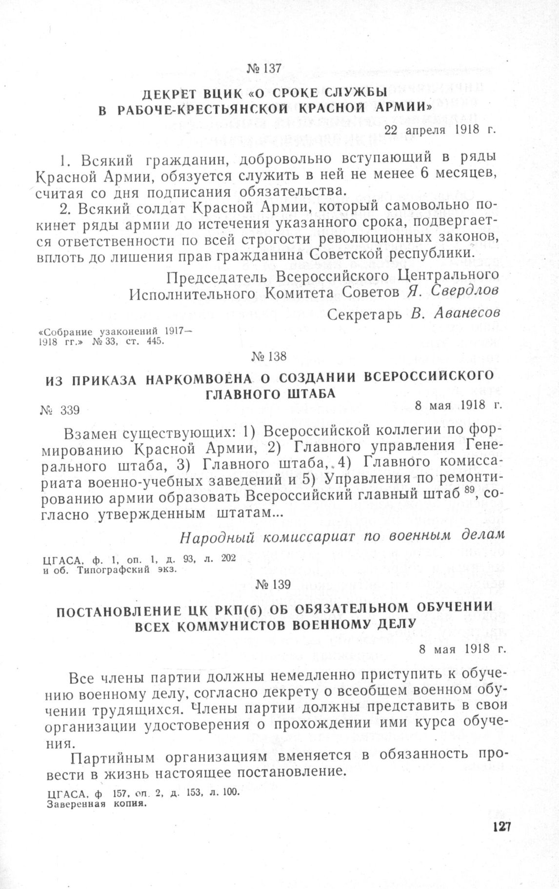 Декрет ВЦИК «О сроке службы в Рабоче-крестьянской Красной армии». 22 апреля 1918 г. // «Собрание узаконений 1917-1918 гг.» № 33, ст. 445.