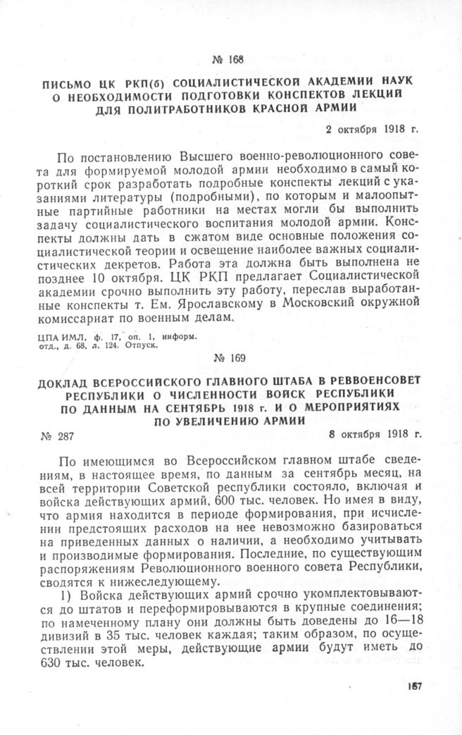 Письмо ЦК РКП(б) Социалистической Академии Наук о необходимости подготовки конспектов лекции для политработников Красной армии. 2 октября 1918 г. // ЦПА ИМЛ, ф. 17, oп. 1, информ. отд., д. 68, л. 124. Отпуск.
