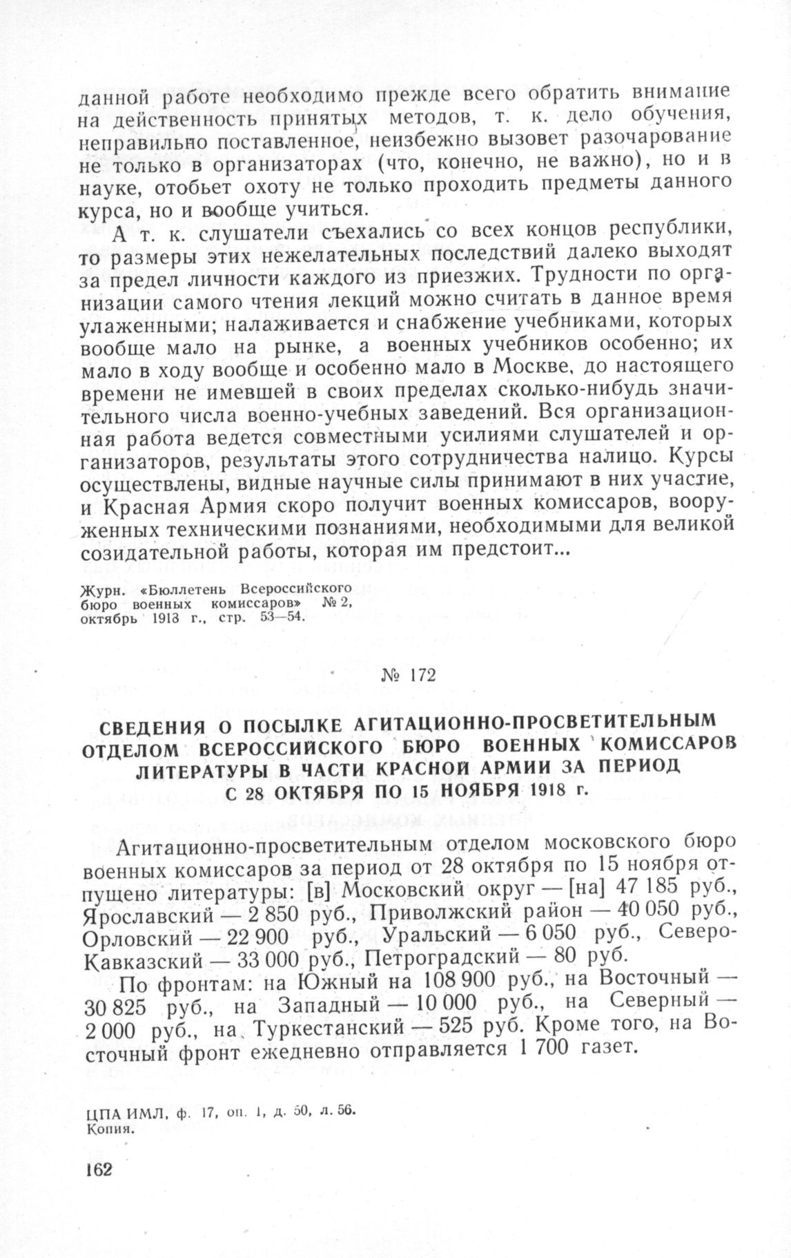 Сведения о посылке Агитационно-просветительным отделом Всероссийского бюро военных комиссаров литературы в части Красной армии за период с 28 октября по 15 ноября 1918 г. // ЦПА ИМЛ, ф. 17. оп. 1, д. 50. л. 56. Копия.