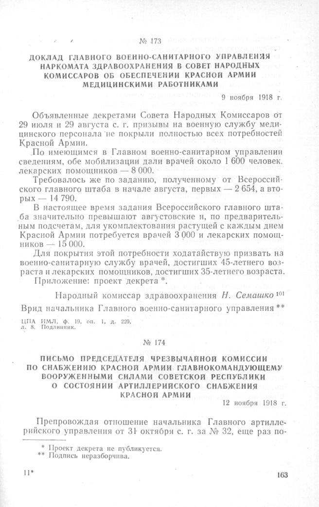 Доклад Главного Военно-санитарного управления Наркомата Здравоохранения в Совет Народных Комиссаров об обеспечении Красной армии медицинскими работниками. 9 ноября 1918 г. // ЦПА ИМЛ, ф. 19, oп. 1, д. 220, Л. 8. Подлинник.