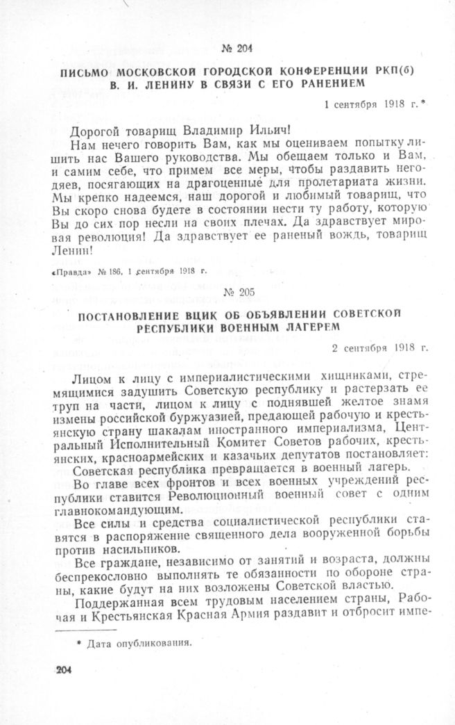Письмо Московской городской конференции РКП(б) В.И. Ленину в связи с его ранением. 1 сентября 1918 г. // «Правда» № 186, 1 сентября 1918 г.