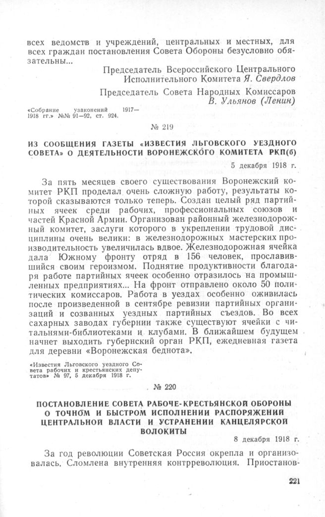 Из сообщения газеты «Известия Льговского уездного Совета» о деятельности Воронежского комитета РКП(б). 5 декабря 1918 г. // «Известия Льговского уездного Совета рабочих и крестьянских депутатов» № 97, 5 декабря 1918 г.