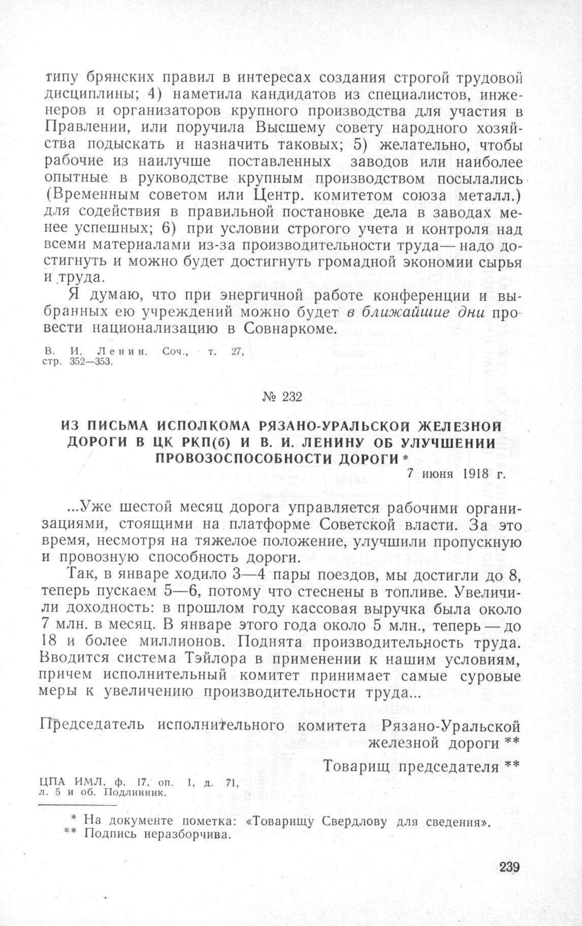 Из письма Исполкома Рязано-Уральской железной дороги в ЦК РКП(б) и В.И. Ленину об улучшении провозоспособности дороги. 7 июня 1918 г.