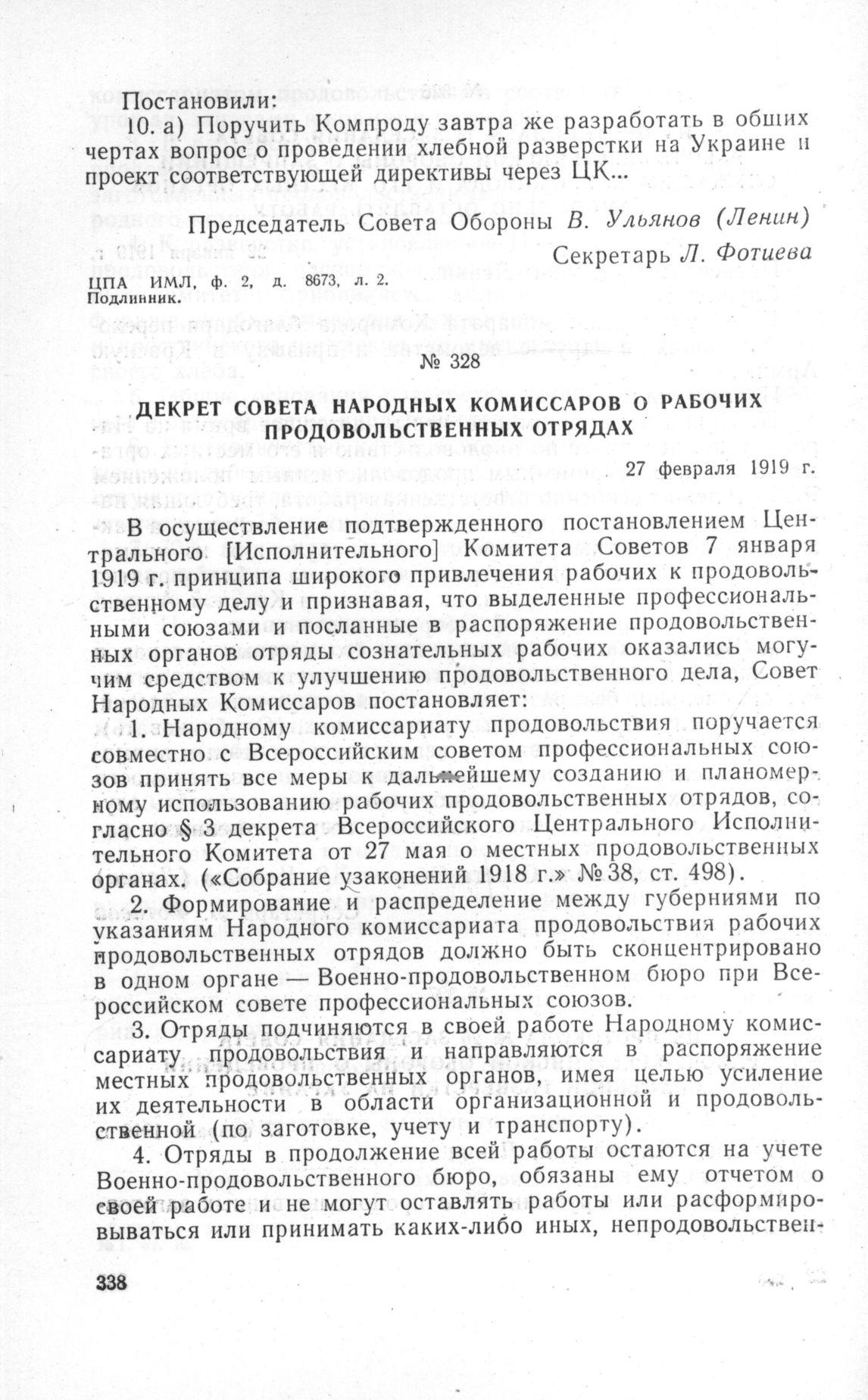Декрет Совета Народных Комиссаров о рабочих продовольственных отрядах. 27 февраля 1919 г. // «Собрание узаконений 1919 г.» № 10-11, ст. 106.