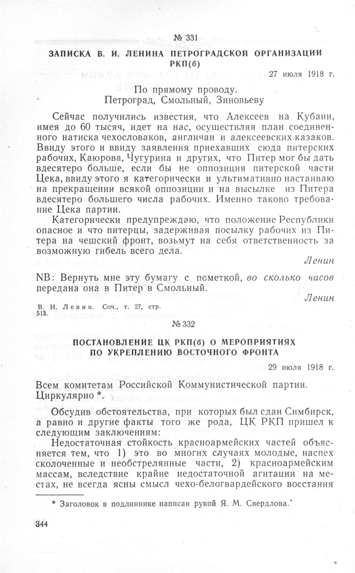 Записка В.И. Ленина Петроградской организации РКП(б). 27 июля 1918 г. // В.И. Ленин. Соч., т. 27, стр. 513.