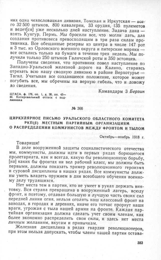 Циркулярное письмо Уральского областного комитета РКП(б) местным партийным организациям о распределении коммунистов между фронтом и тылом. Октябрь-ноябрь 1918 г. // Партархив Пермского обкома КПСС, ф. 61, оп. 1, д. 15, л. 11. Копия.