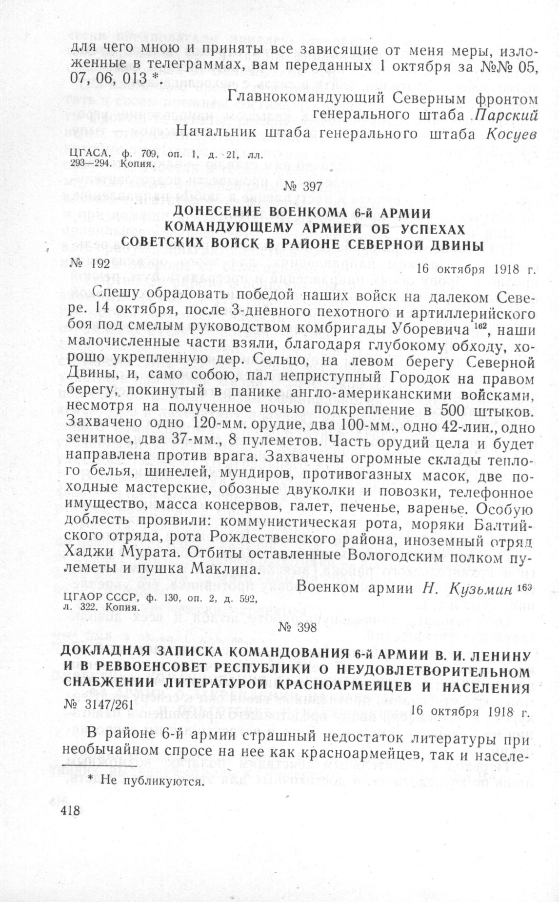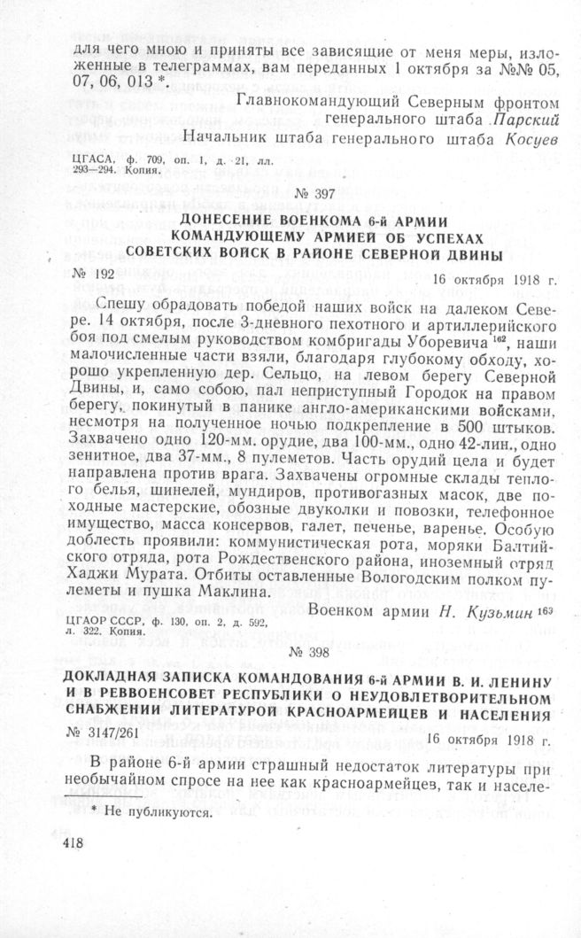 Донесение Военкома 6-й армии Командующему армией об успехах советских войск в районе Северной Двины. 16 октября 1918 г. // ЦГАОР СССР, ф. 130, оп. 2, д. 592, л. 322. Копия.