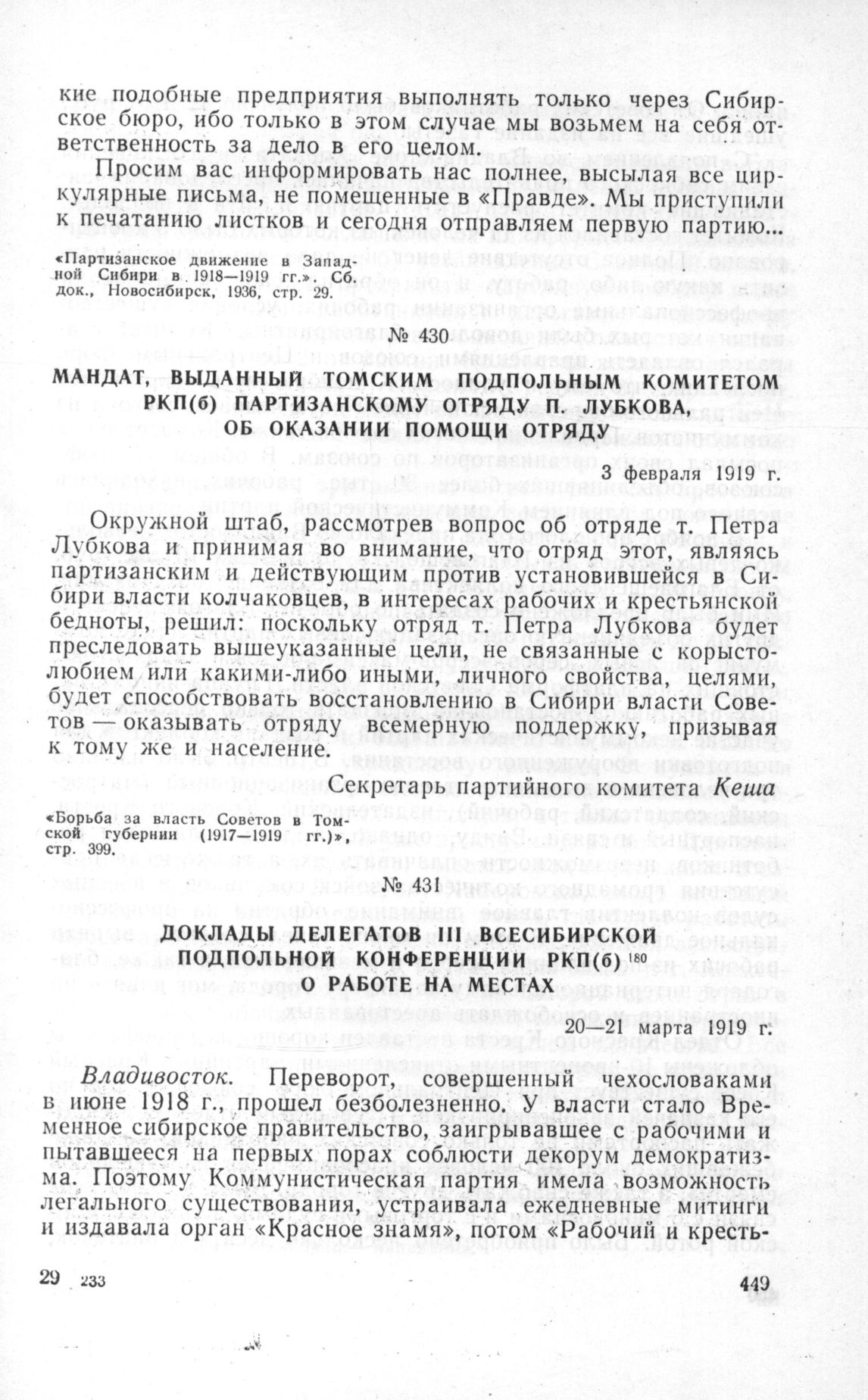 Мандат, выданный Томским подпольным комитетом РКП(б) партизанскому отряду П. Лубкова, об оказании помощи отряду. 3 февраля 1919 г. // «Борьба за власть Советов в Томской губернии (1917—1919 гг.)», стр. 399.