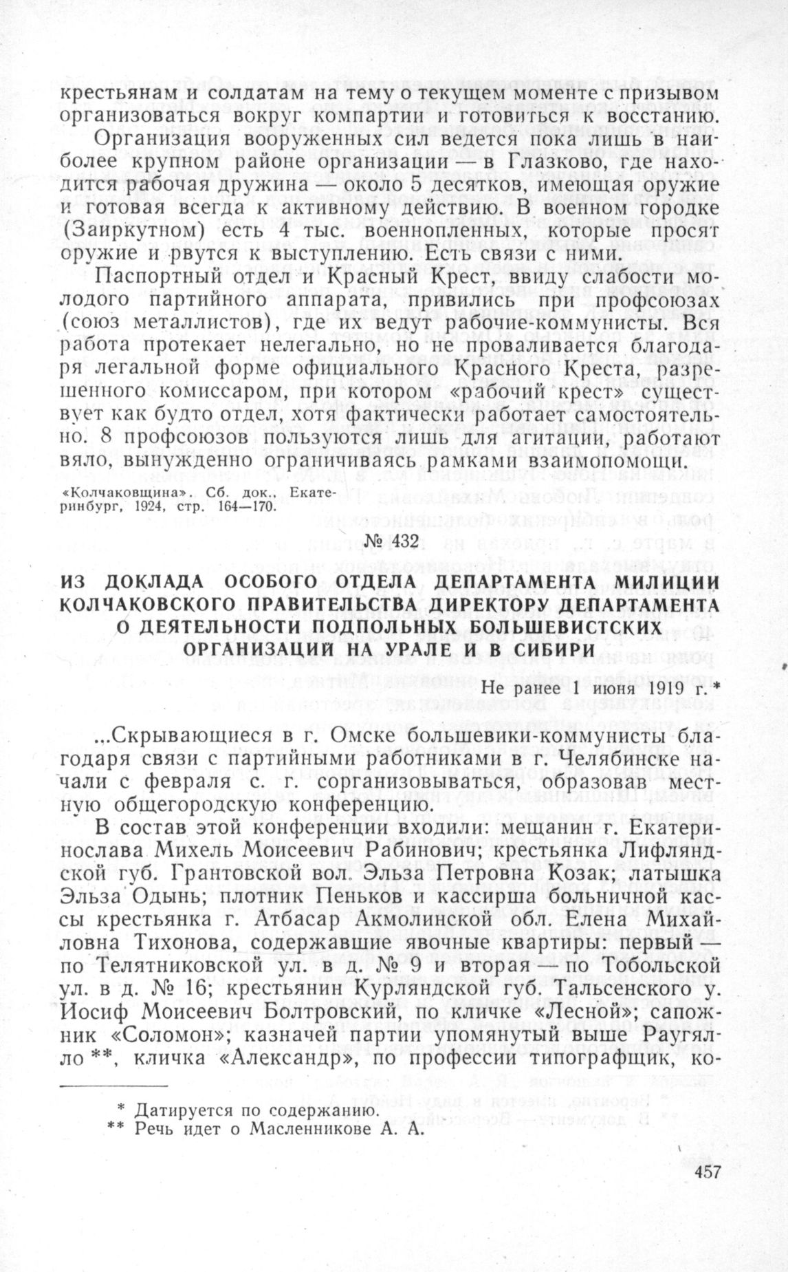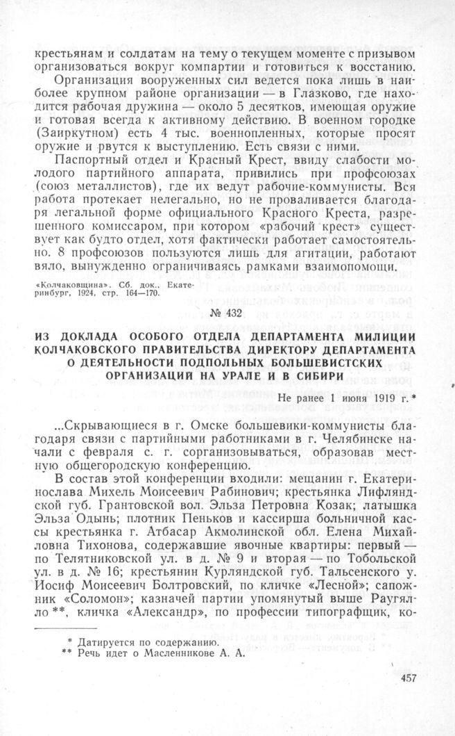 Из доклада Особого отдела Департамента милиции колчаковского правительства директору Департамента о деятельности подпольных большевистских организаций на Урале и в Сибири. Не ранее 1 июня 1919 г. // Партархив Новосибирского обкома КПСС, ф. 5, оп. 2, д. 1500, лл. 1-10. Копия.