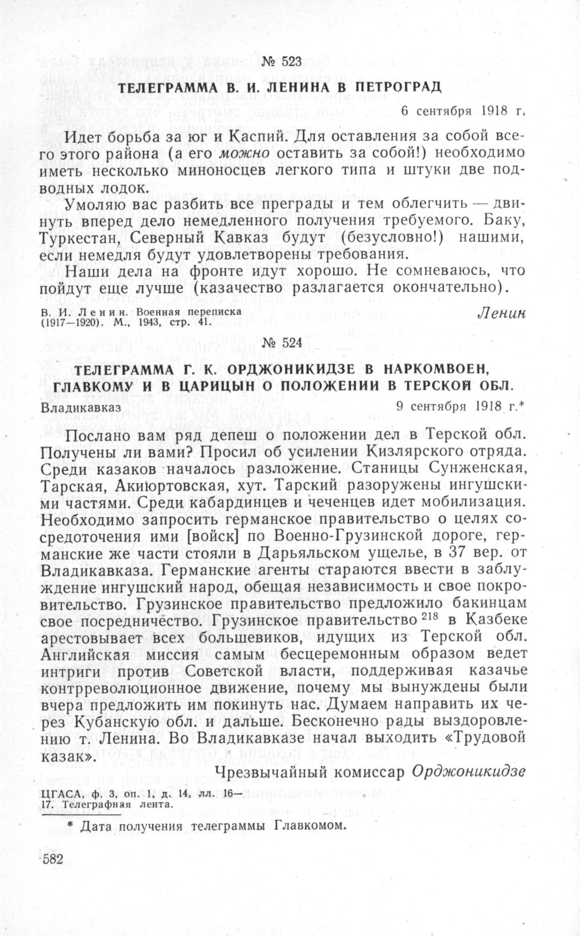 Телеграмма В.И. Ленина в Петроград. 6 сентября 1918 г. // В.И. Ленин. Военная переписка (1917-1920). М., 1943, стр. 41.